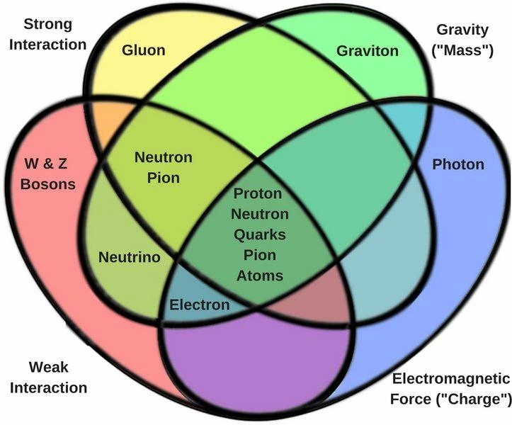 | Strong interaction | The strong force holds the nucleus of an atom together. A gluon mediates the strong interaction between quarks, binding them into groups according to quantum chromodynamics (QCD), forming hadrons such as protons and neutrons. |